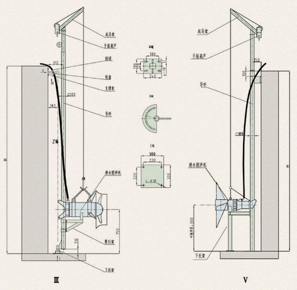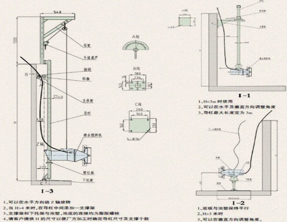 潛水?dāng)嚢铏C(jī)的潛水深度可以根據(jù)用戶需求進(jìn)行垂直上下調(diào)節(jié)。吊架座、支撐和下托架與池的連接均為膨脹螺栓固定,無需預(yù)留孔。客戶訂貨時,請?zhí)峁┏厣頗,以便我公司生產(chǎn)時確定導(dǎo)軌尺寸及支撐架的數(shù)量。